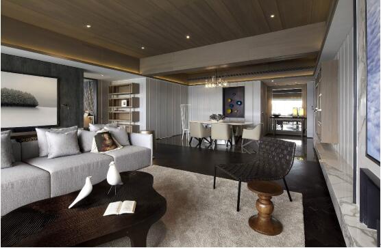 3、客厅中间的茶几,借鉴具有写意美感的“枯山水”景观设计,用线条表示水纹,让实木材质表现出灵动轻盈的意境。