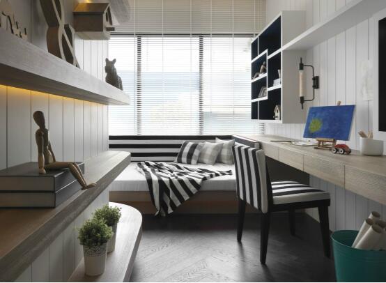 不规则尺寸房间,李太太最初想要做成小客房,设计师实地考察后建议做多功能房,既是书房,也可以作为卧室;在靠窗位置放置软榻,看书、画画疲惫时可以小憩;有客人时,也可作为暂时的卧房。