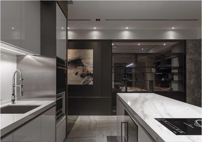 整体以灰调为基础的公共空间,设计师首先利用地坪材质差异区分内外场域,而内部空间则透过大理石、金属、灰玻等壁面材质划分餐厨与客厅范围,其中,作为客厅视觉主墙的大理石墙,独特的天然纹理与暖灰色彩,为偏冷调的空间注入和谐的温暖。