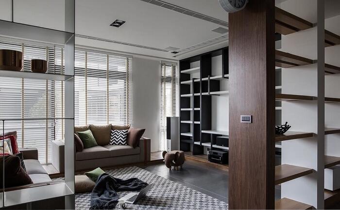 四楼运用黑色铁件、木质材料组成的独立书房,满足男主人对工业风的期待。
