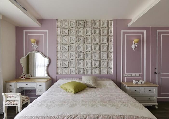 异材质结合与缤纷的色彩,营造各个空间不同的氛围,则是除了多元化收纳展示之外的另一个特色。玄关地坪铺上斑驳带银边的彩色意大利进口砖,多彩却不工整的切割工法,画龙点睛的为小空间增色。客餐厅以蓝、绿搭配木色及红砖色文化石,让公领域充满温馨乡村风。主卧与儿童房则以清新柔和的紫与蓝,营造最适合休憩的氛围。