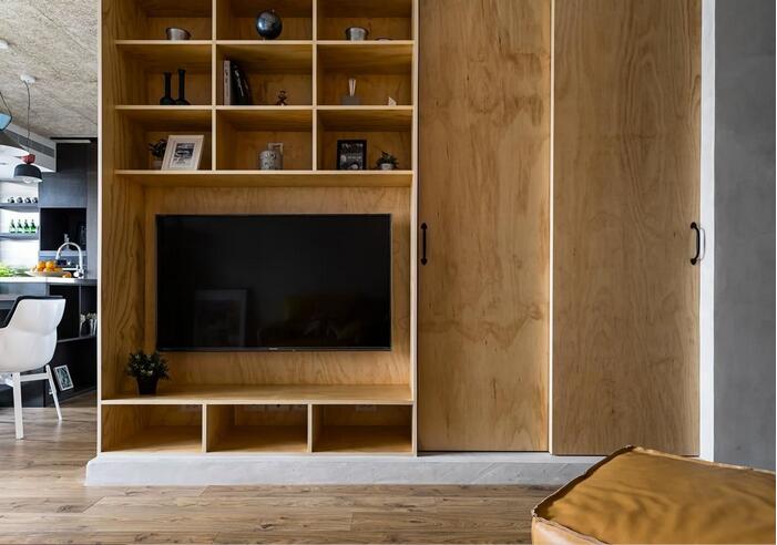 客厅电视柜选用桦木花纹点缀的夹板设计,不仅经济实惠,还能带来自然原始气息。