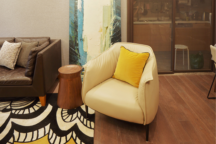 客厅是郭小姐的主要活动区,设计师选择多种色彩搭配,符合郭小姐多彩随性的性格,放弃传统3+2+1沙发组合形式,结合更具灵活性的单椅和懒人沙发,即使多人在客厅聊天也不显得局促。